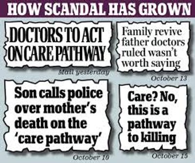 You should also be aware that doctors have been asked to identify the one in every hundred of their patients who are likely, only likely, since it’s impossible to really say, who are going to die over the next 12 months. This fits in with the Gold Care Standard 2005 promoted by the Department of Health and set to save the government more than £1 billion a year. We believe that patients singled out for this are put on a list that finds its way to hospitals and is used to single out people for so called ‘end of life care.’WHAT THE PAPERS SAY Put 1 in 100 patients on death list, GPs told: Frailest to be asked to choose ‘end of life’ care. Steve Doughty Daily Mail